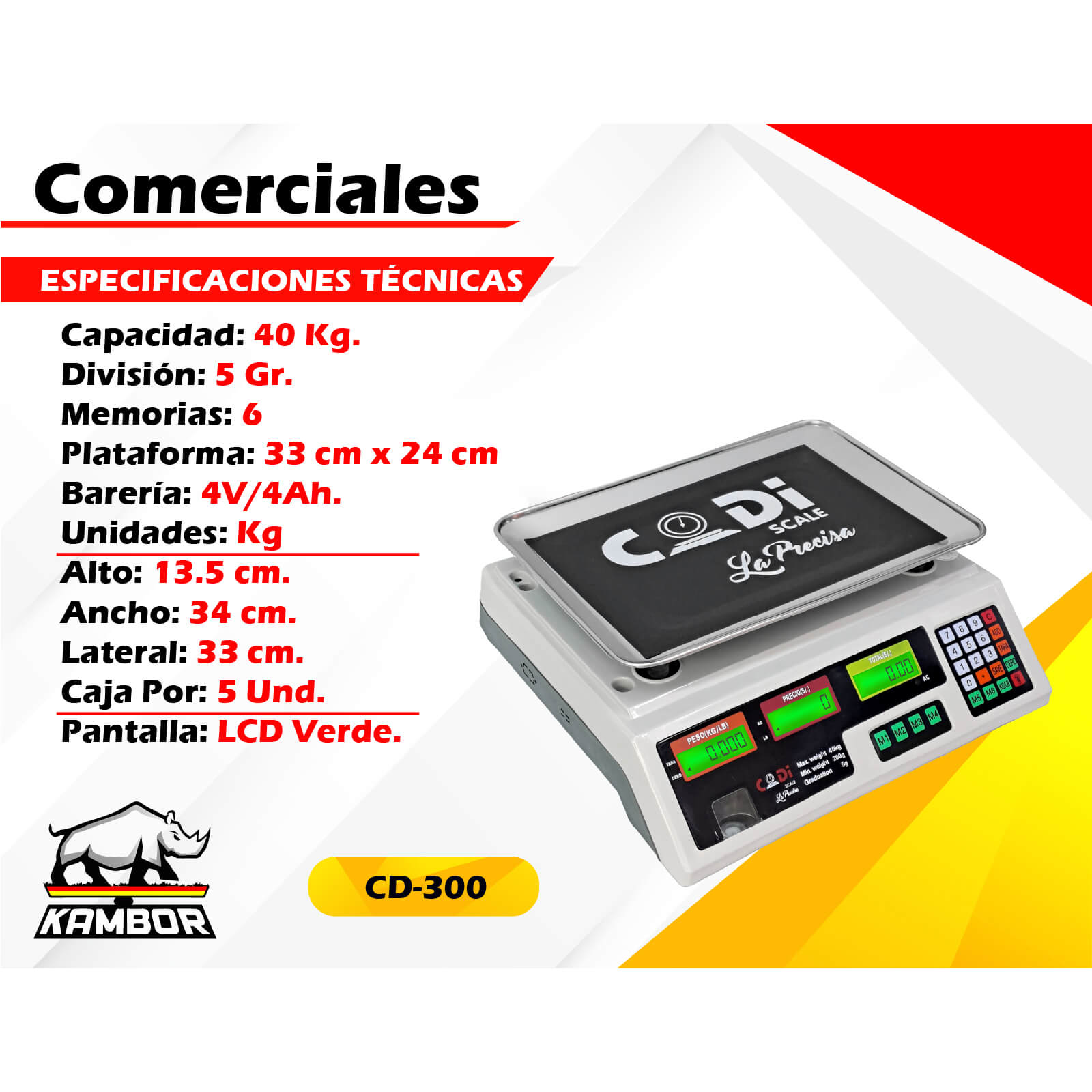 La Balanza Comercial CD-300 es una balanza electrónica precisa y resistente, ideal para mercados, bodegas, minimarkets y negocios que requieren mediciones confiables. Cuenta con una capacidad de 40 kg, división de 5 gramos, 6 memorias, batería de larga duración 4V/4Ah, plataforma amplia de 33 × 24 cm y pantalla LCD verde de alta visibilidad.